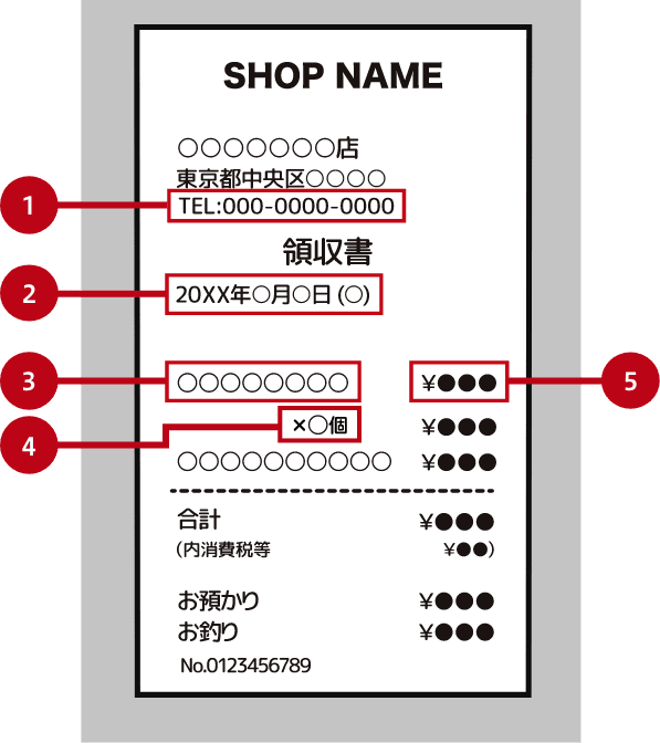 レシート有効期間中に対象商品をご購入いただいたレシートを「①購入店舗電話番号」「②お買い上げ日時」「③対象商品名」「④購入個数」「⑤金額」が分かるように撮影してください。これらの事項が判別できない場合は、ご応募が無効となります。
